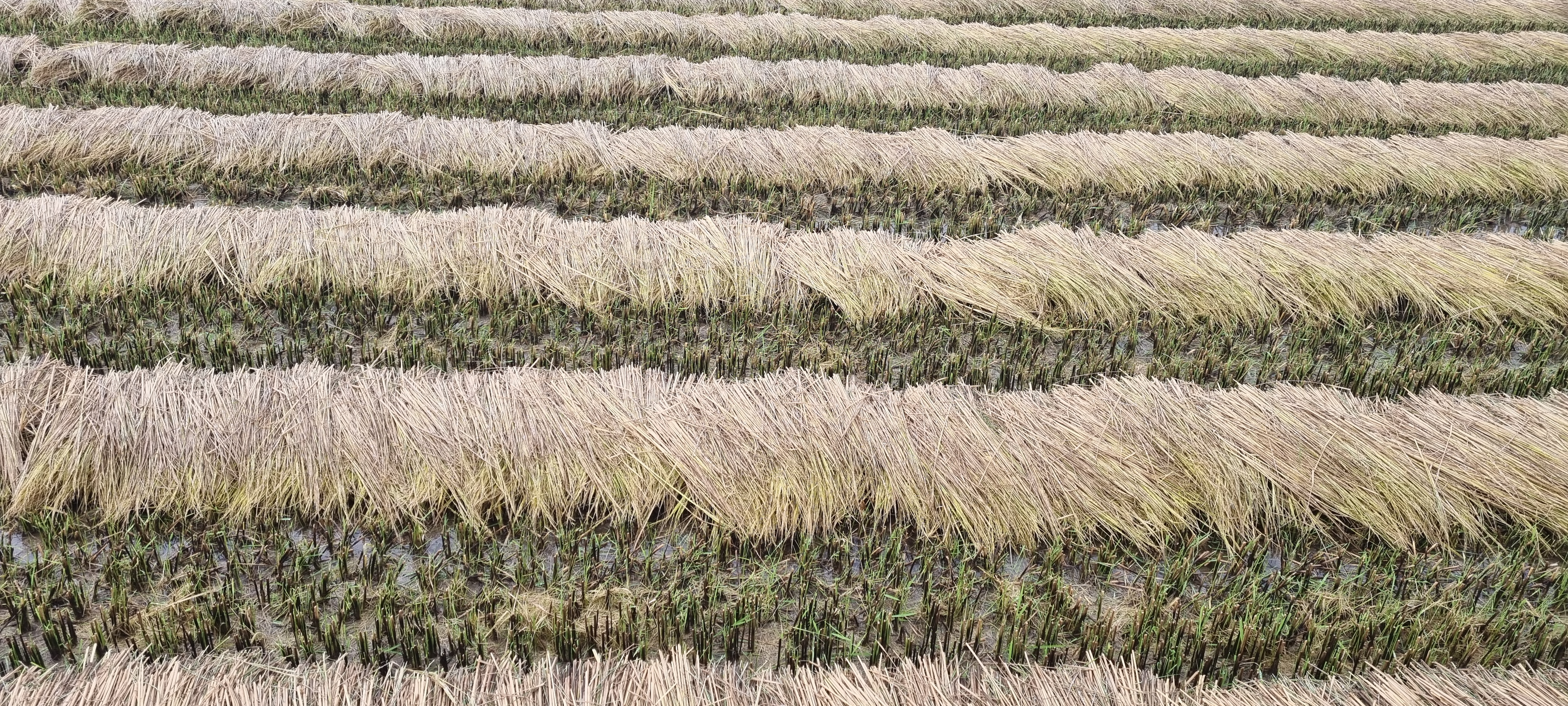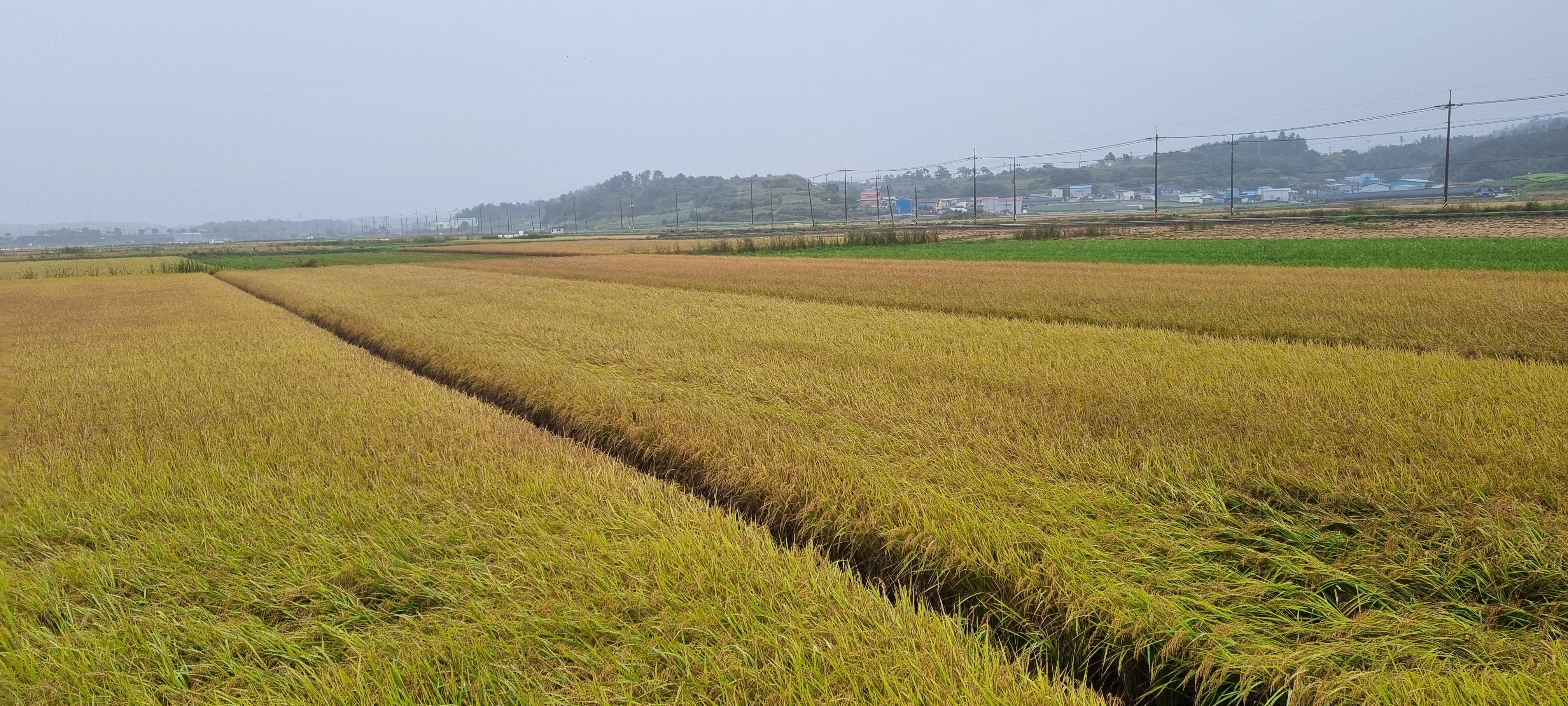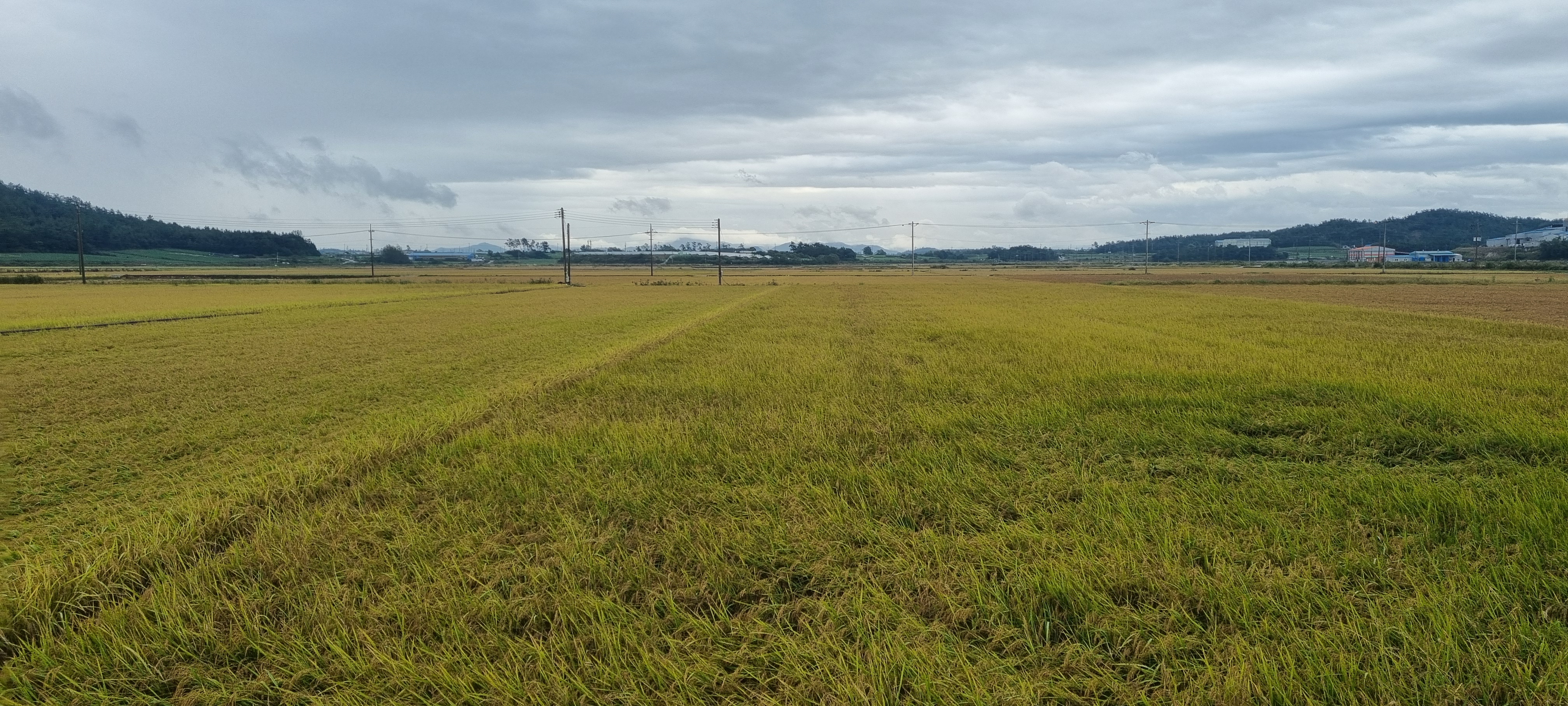 ㅇ코스에 펼쳐진 논은 벼수확이 시동이 걸리는 상태. 아주 일부는 추수를 하고 볏단을 바닥에 나란히 정리(?)해 두었고..