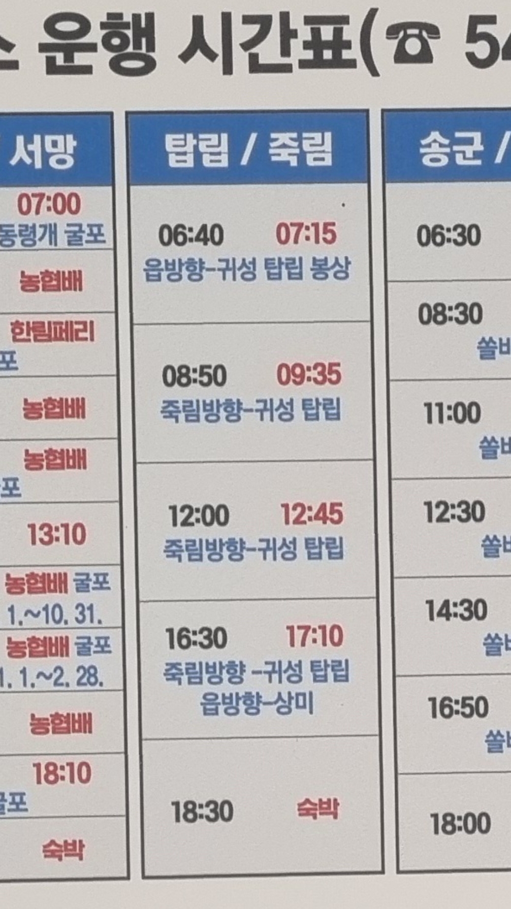좌측 검은 글씨는 터미널 출발시간.. 우측 붉은 글씨는 회차지 출발시간.