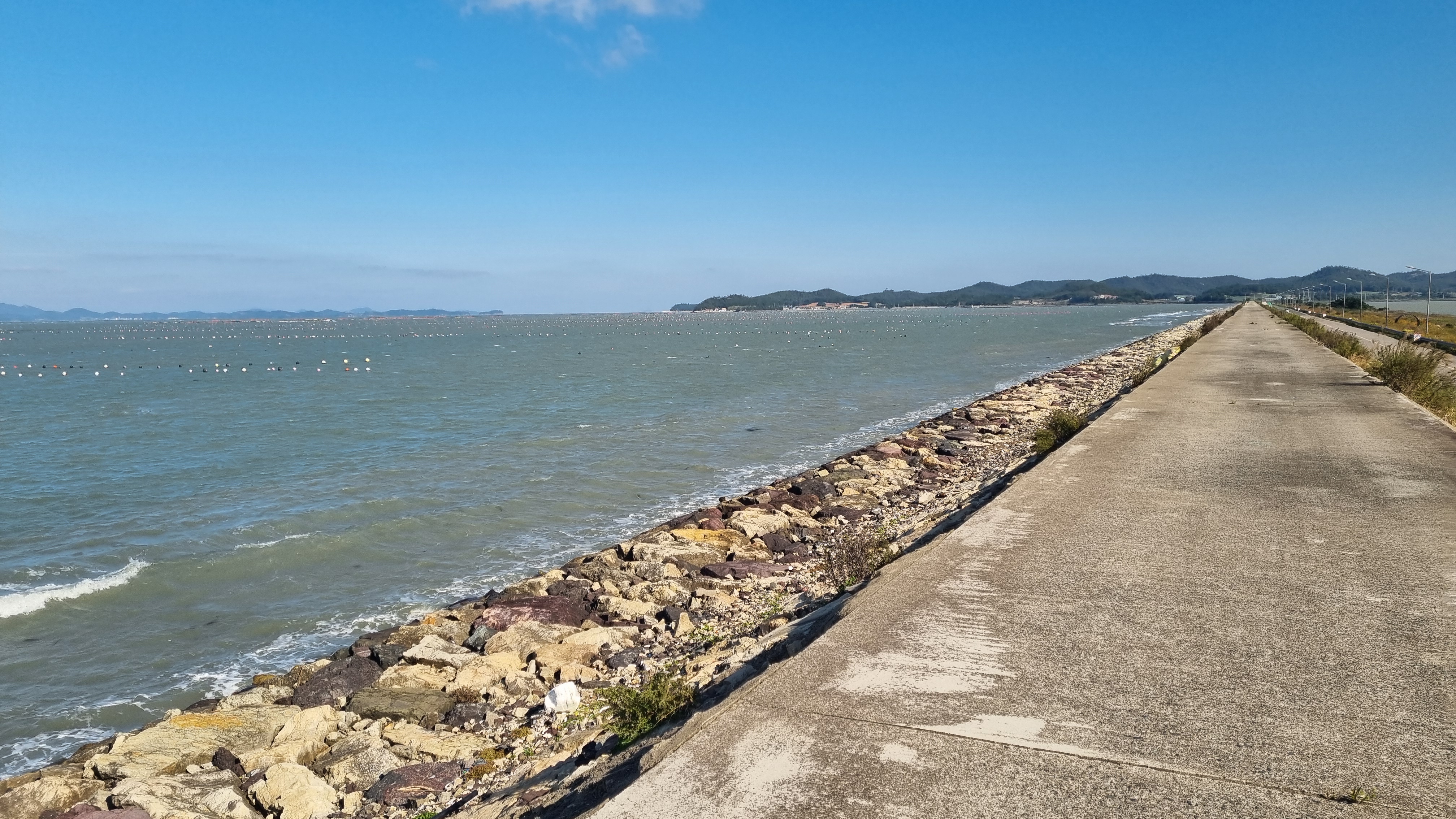 ㅇ나리방조제 길이가 3.2Km으로 강풍 맞으며 둑으로 걸음. 둑 중간지점에 1개 계단만 있어 아래 도로로 내려갈 수 있어.