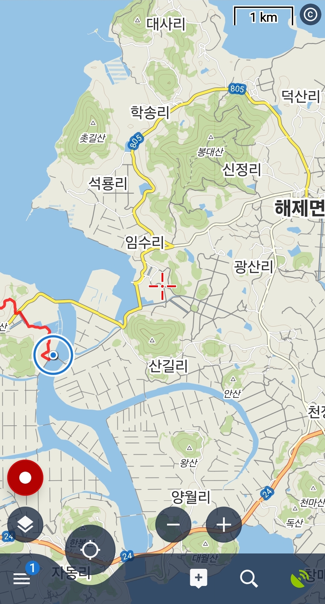 ㅇ 걷는 도중에 체크 시.. 붉은색으로 기록 중.