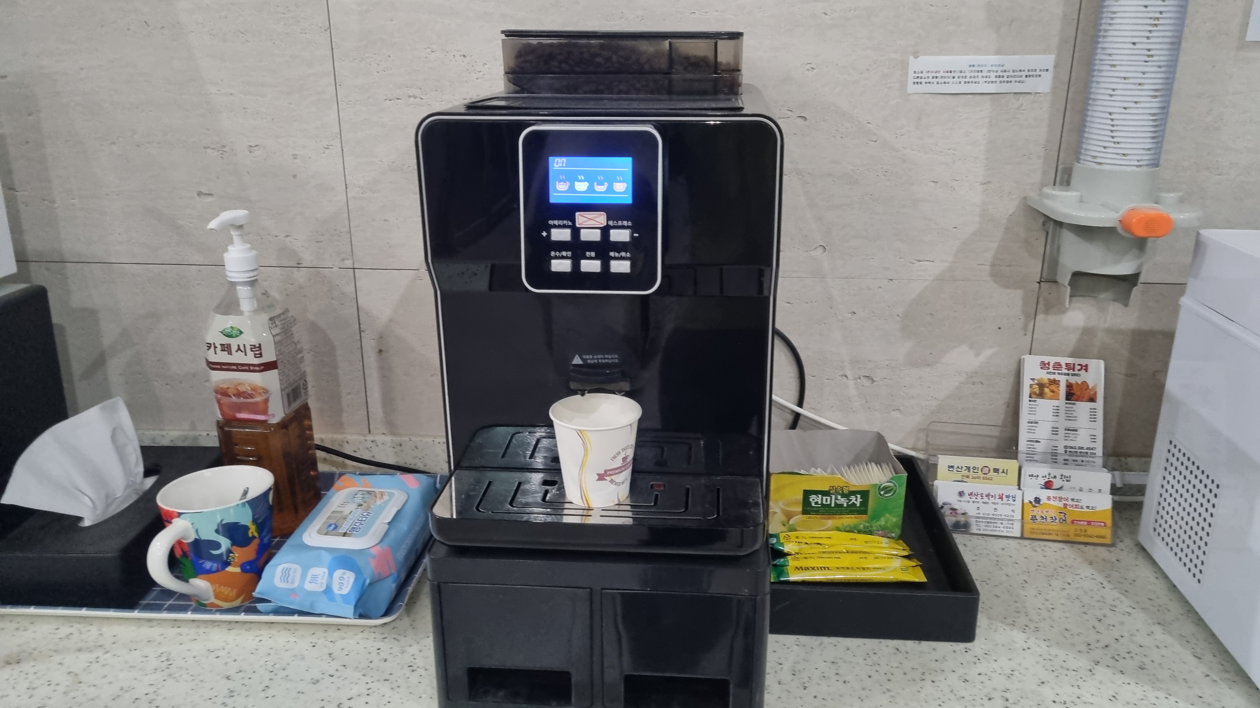 출발 전 로비에서 커피 한잔 내려 마십니다.