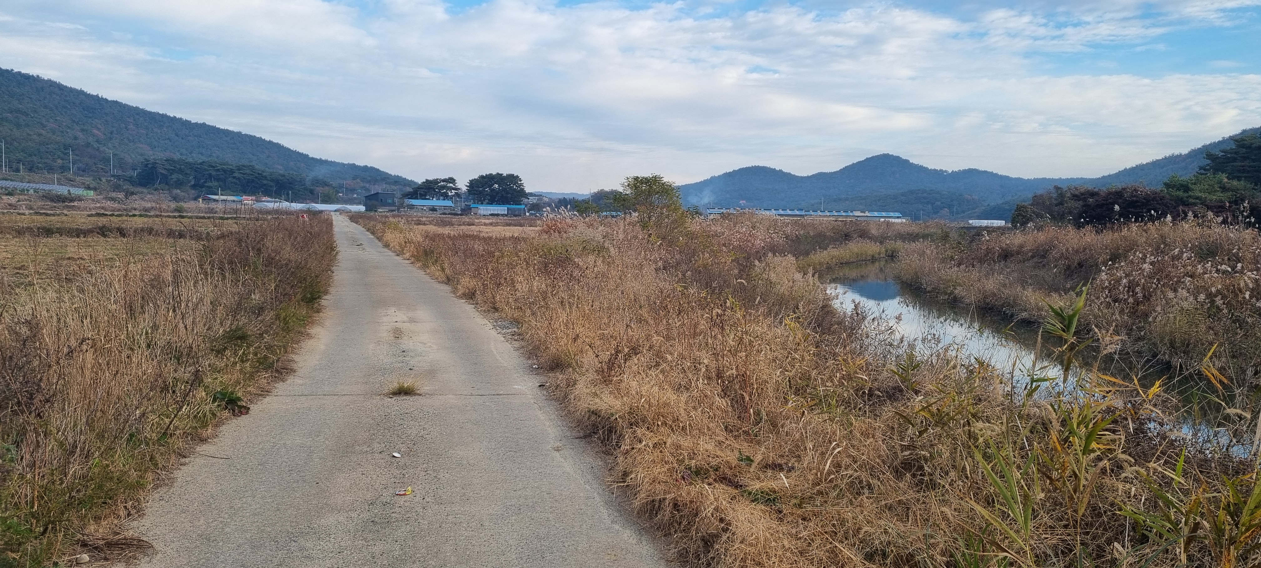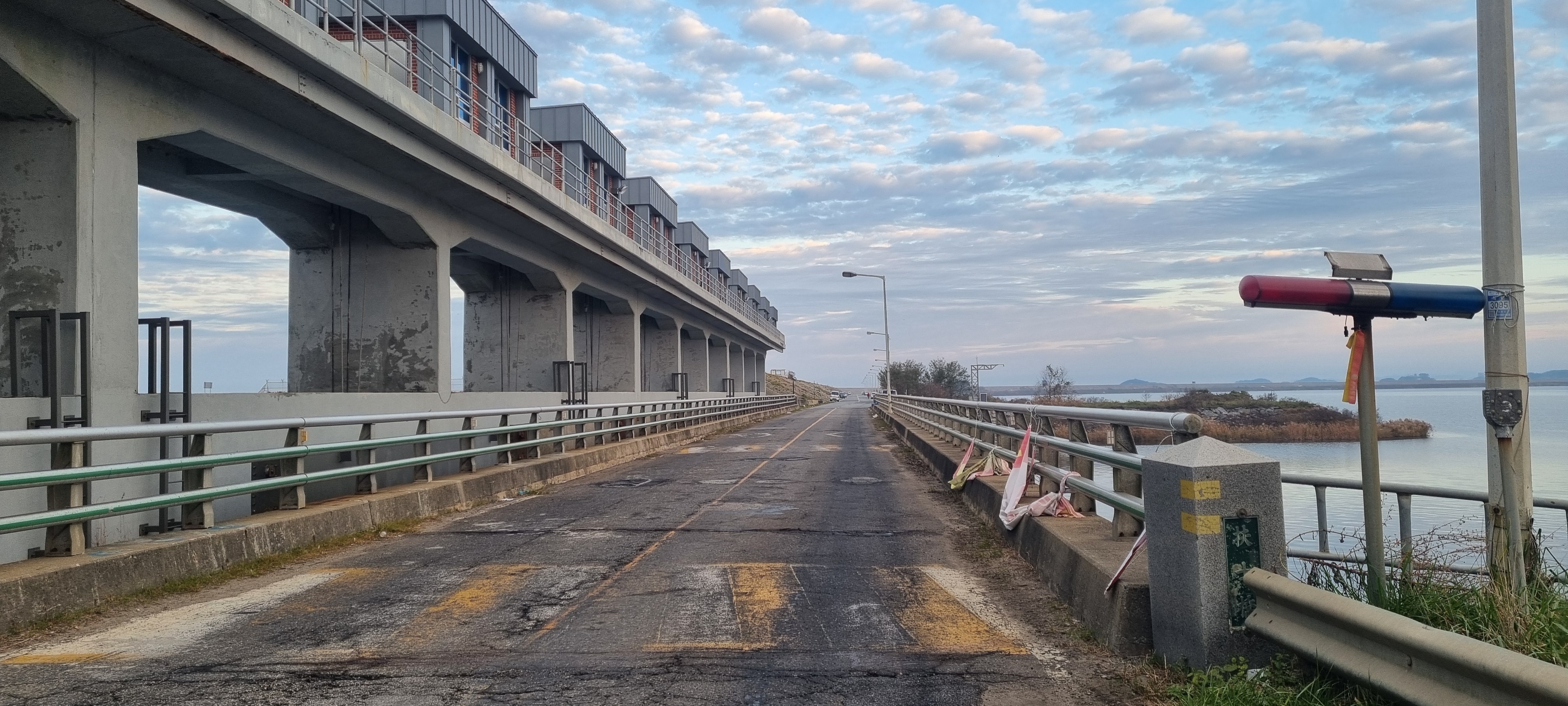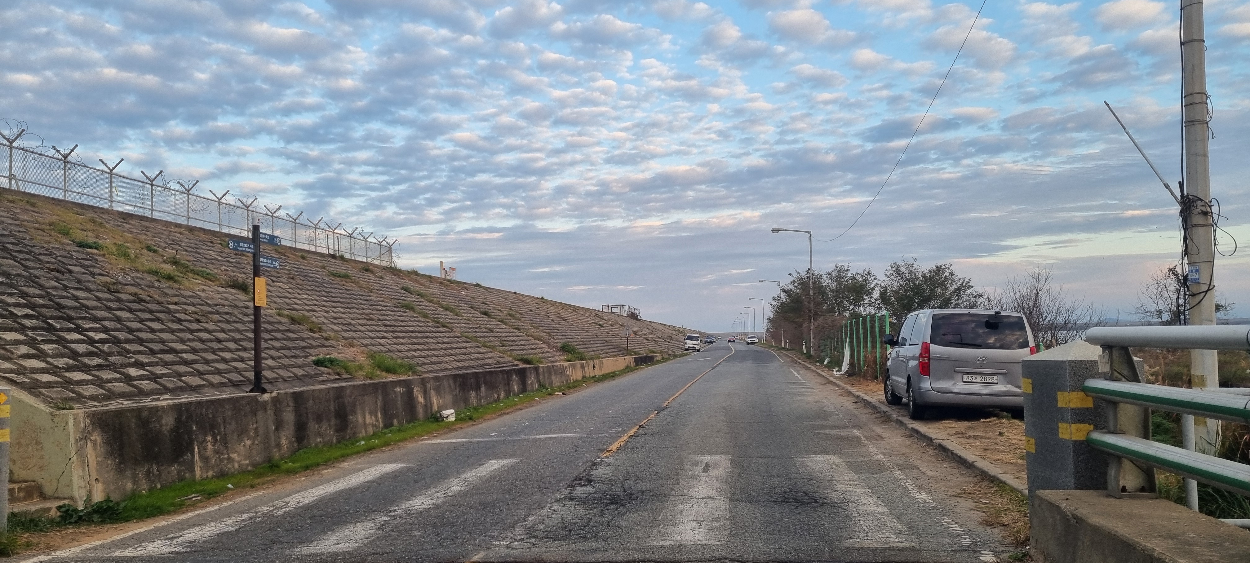 아래로 내려가.. 히치로 지루한 방조제를 건넘.