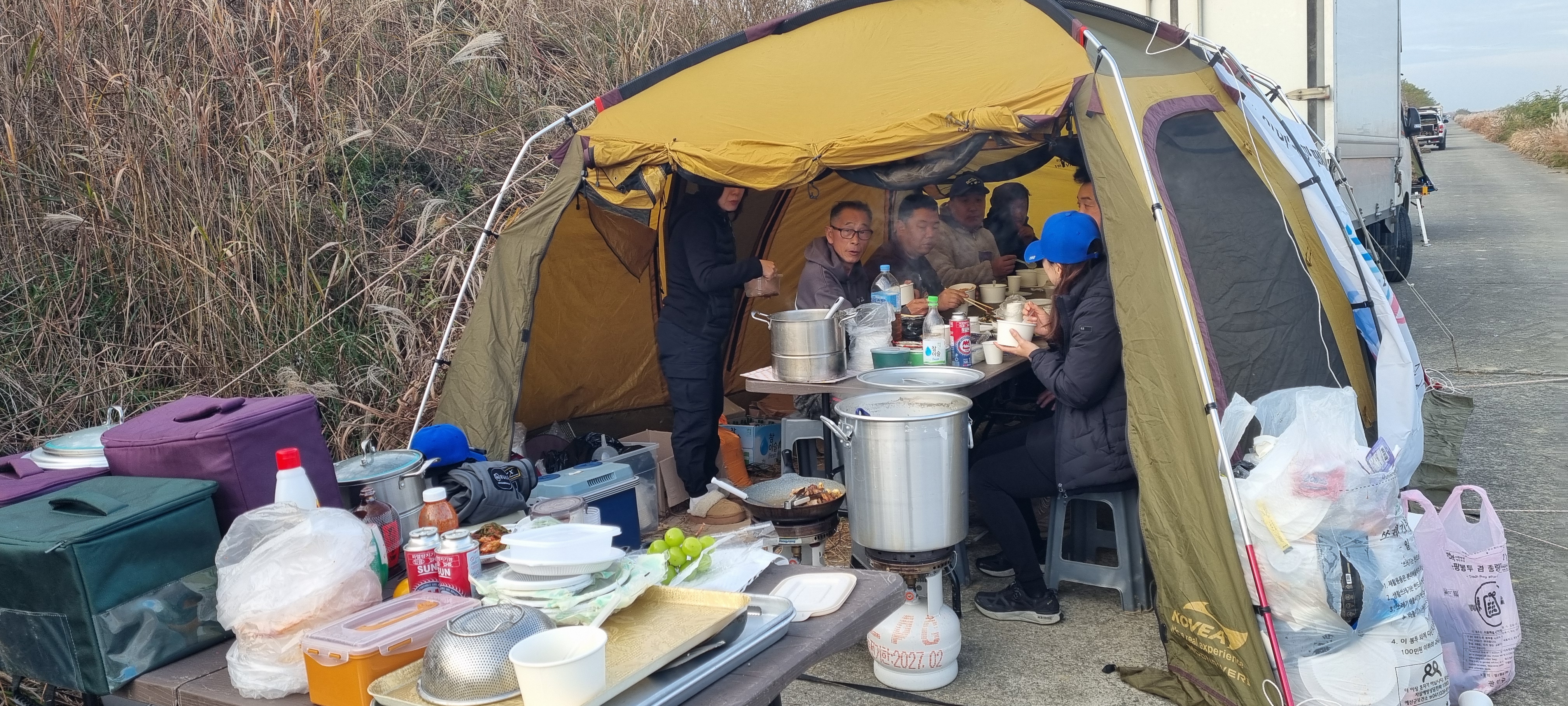 방조제 아래 차박 족이나 야외캠핑용 텐트와 부속 살림살이.. 차량들이 즐비합니다.
