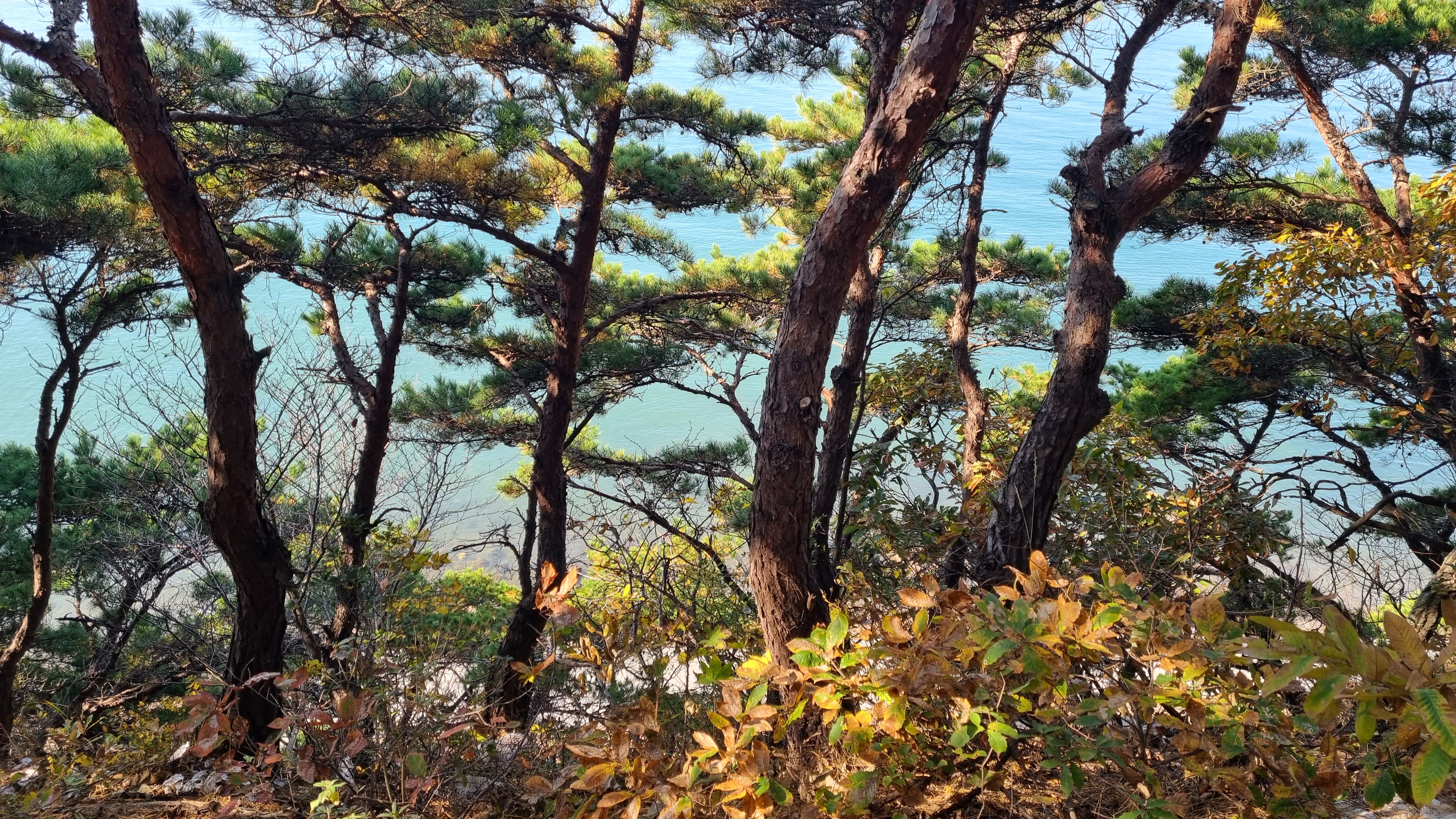 -제가 만조 가까울 듯한 때라 해변 걷기를 포기하고 산허릿길로 걸으며 아래를 보니 일부 구간의 시멘트 길이 물에 잠김.