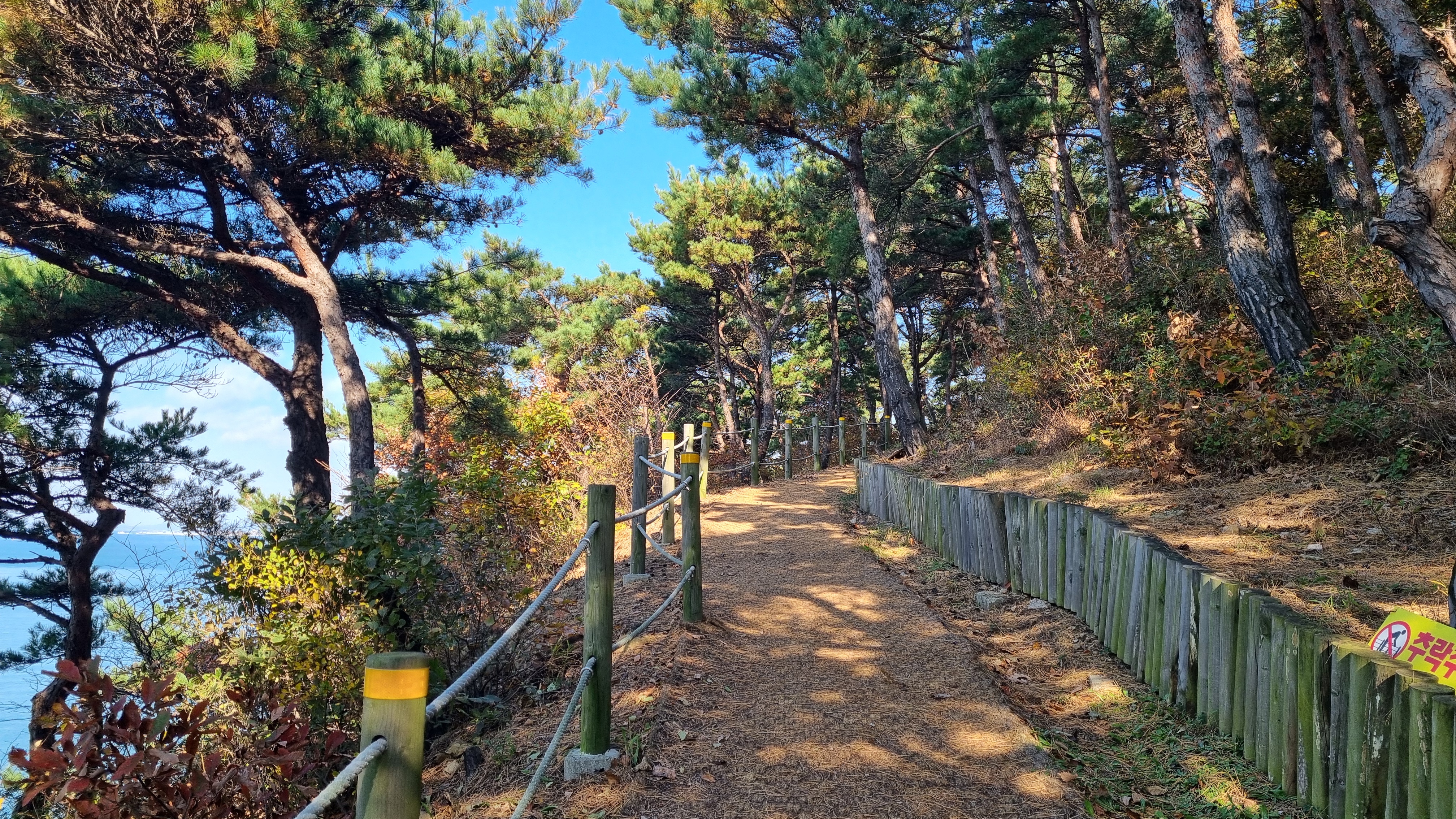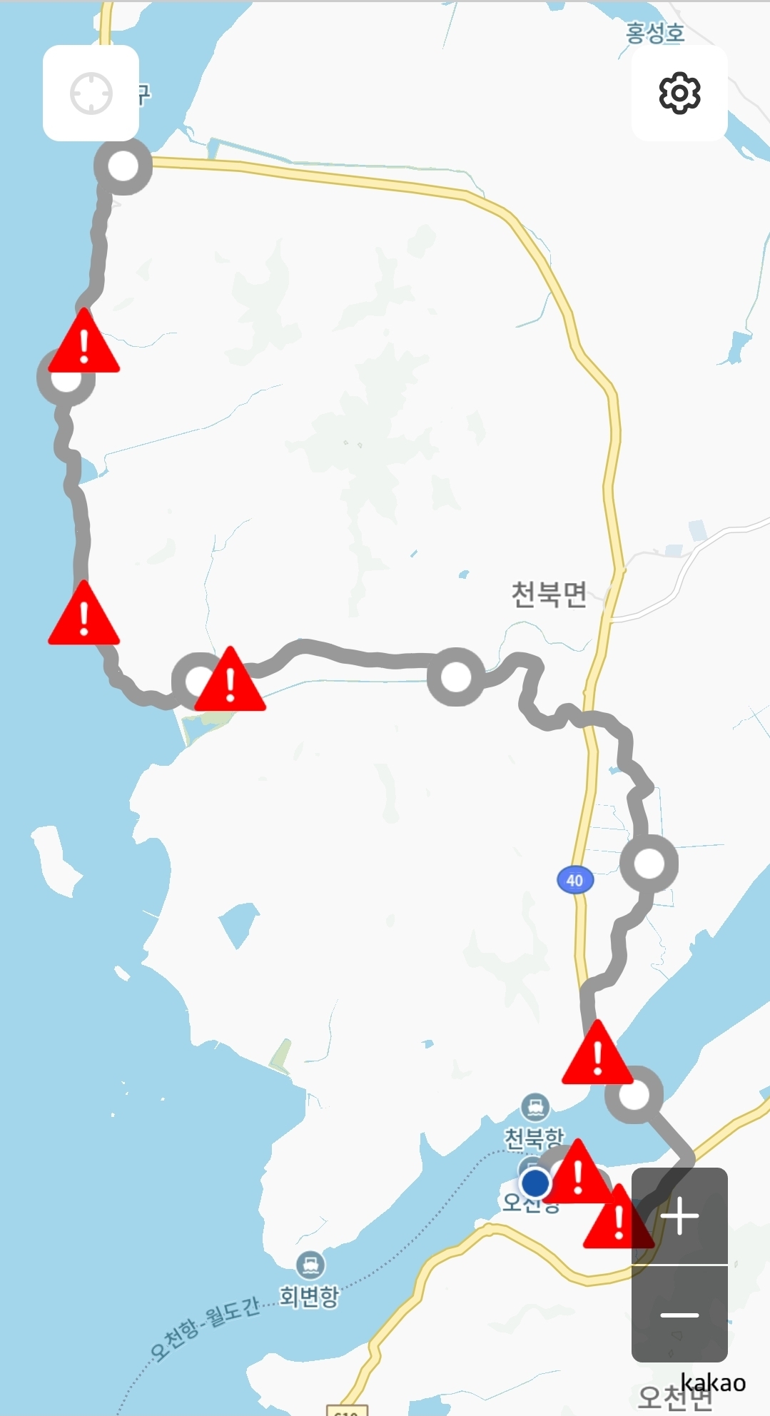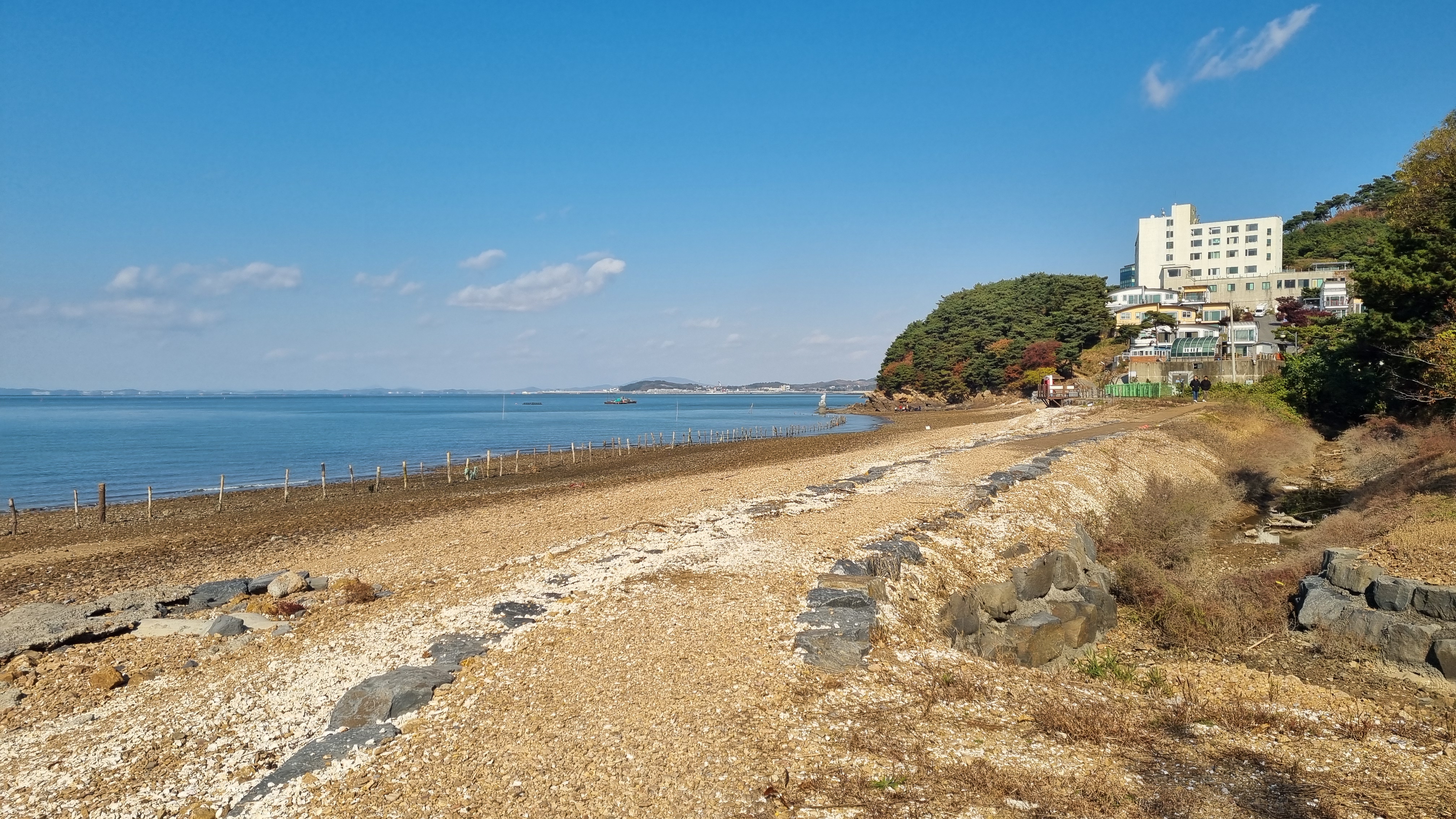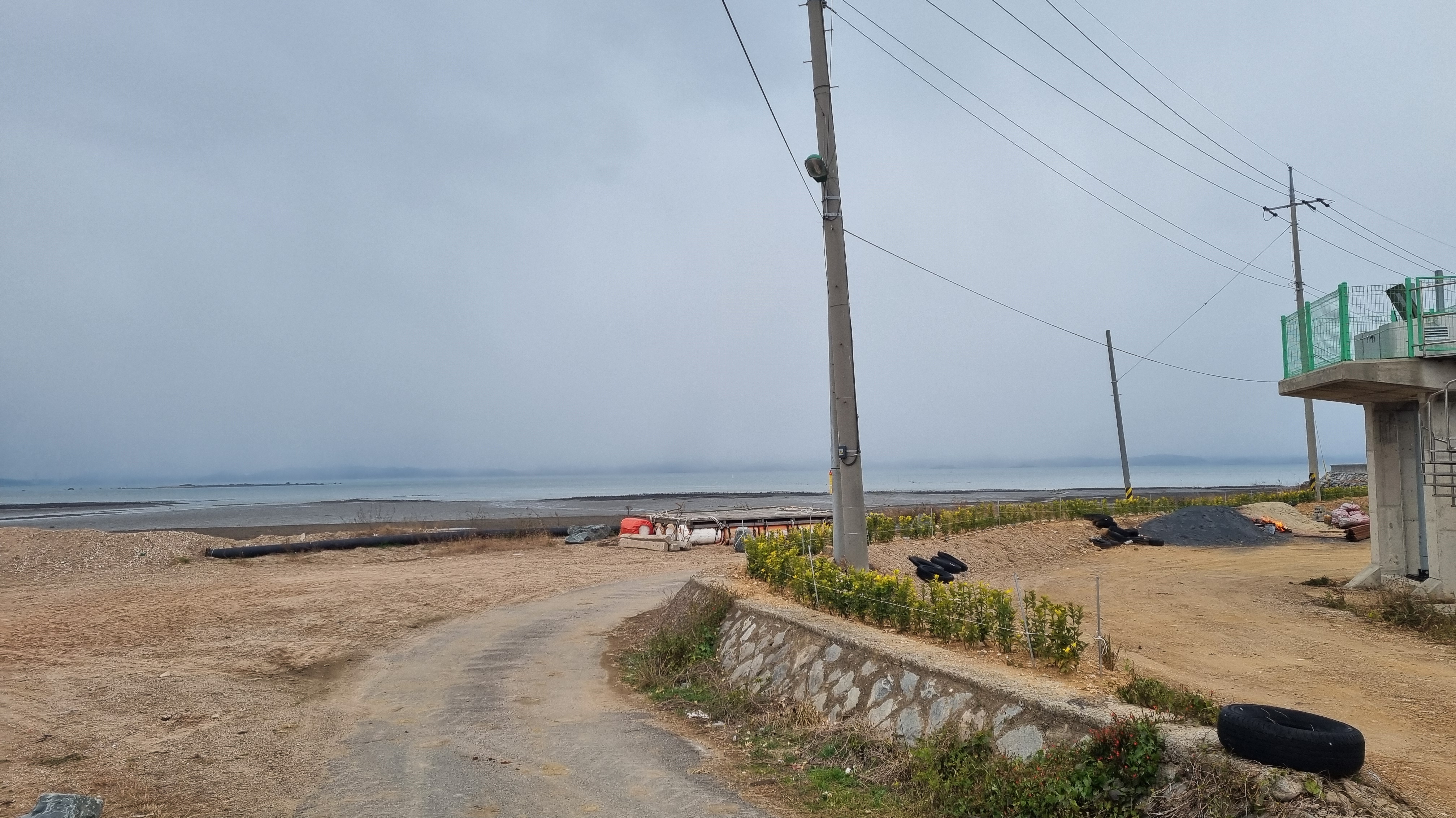 ㅇ천북굴단지 진입직전.. 두루누비앱은 해변 허릿길로 트랙이 잡혀있음. 그러나 간혹 관광객모드로서 해변으로 걷기도 하는데.. 만조 가까이 되는 밀물타임에는 일부 구간이 바닷물에 잠기기도.. 우회루트까지는 필요 없지만 만조시는 반드시 산허릿길로 올라 걷기를 권함.