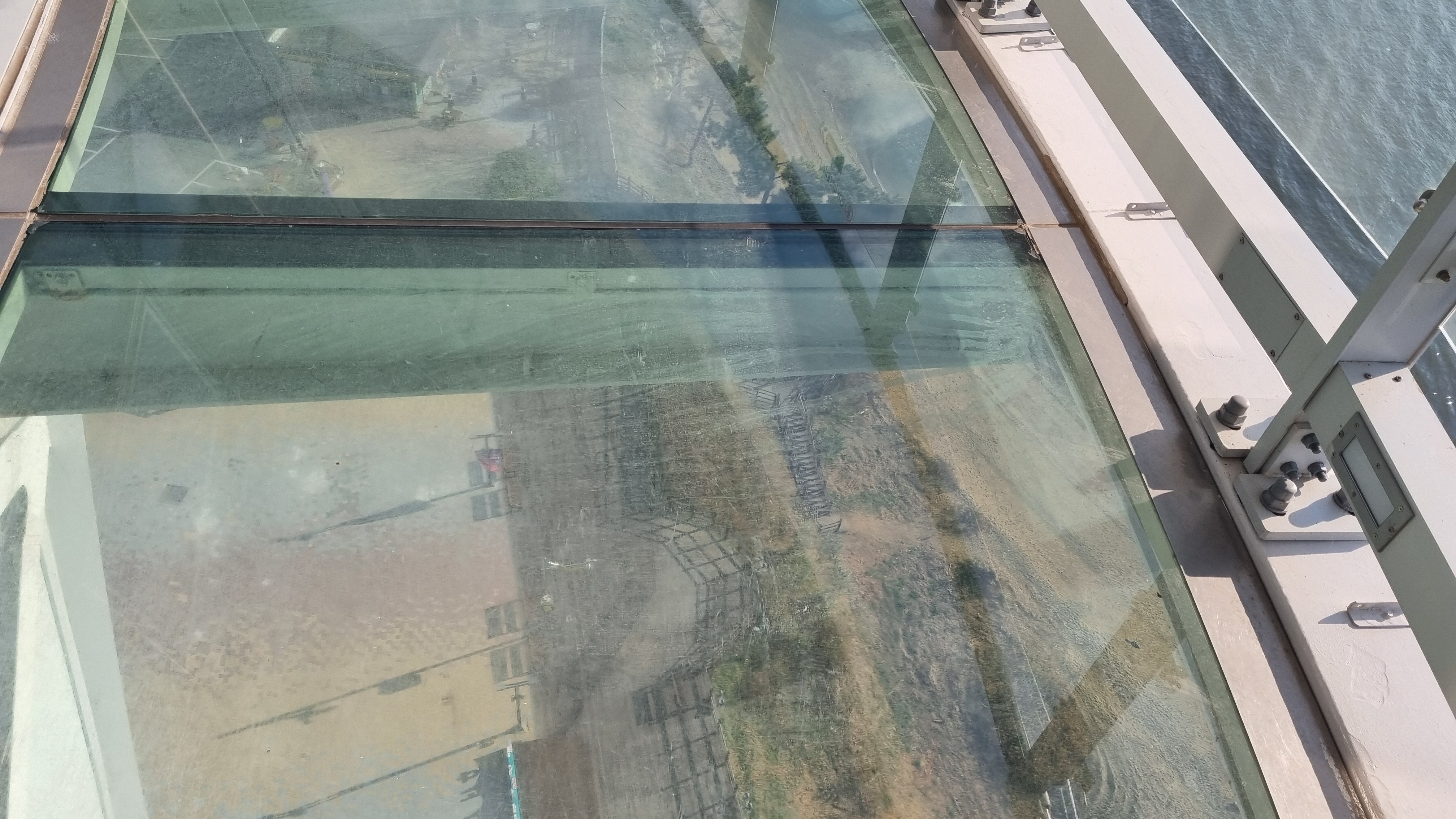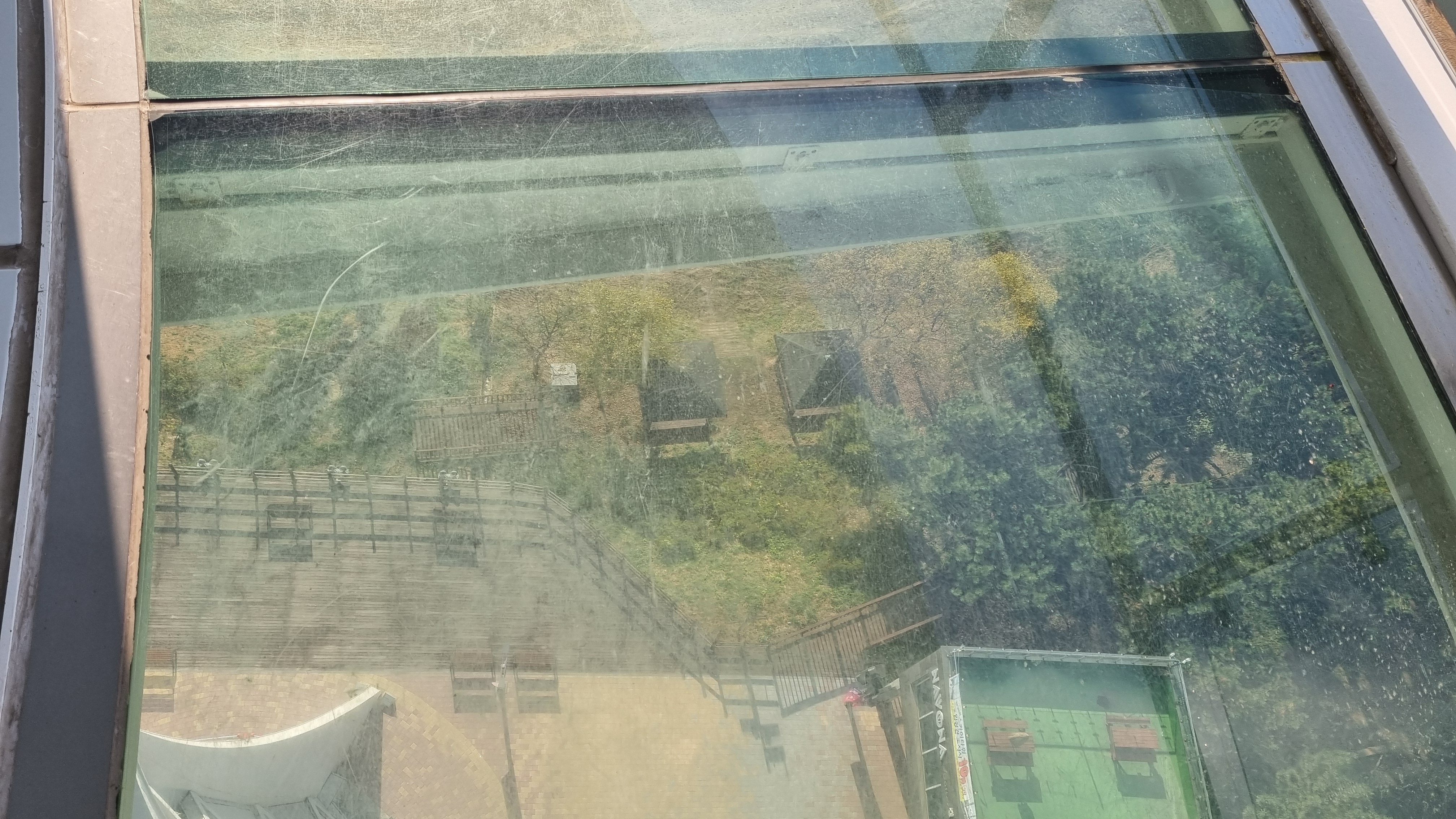 2층 고소 공포를 유발하는 투명유리로 아래 내려다보며 걷기.